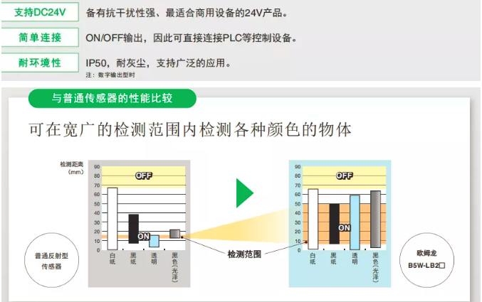 歐姆龍限定反射式光電傳感器是光電傳感器的一種,它是發(fā)射器和接收器置于一體的,由發(fā)射器發(fā)出光信號(hào),并在限定范圍內(nèi)由接收器接受,被檢物反射的光,并引起光電傳感器動(dòng)作,輸出開關(guān)控制信號(hào)。