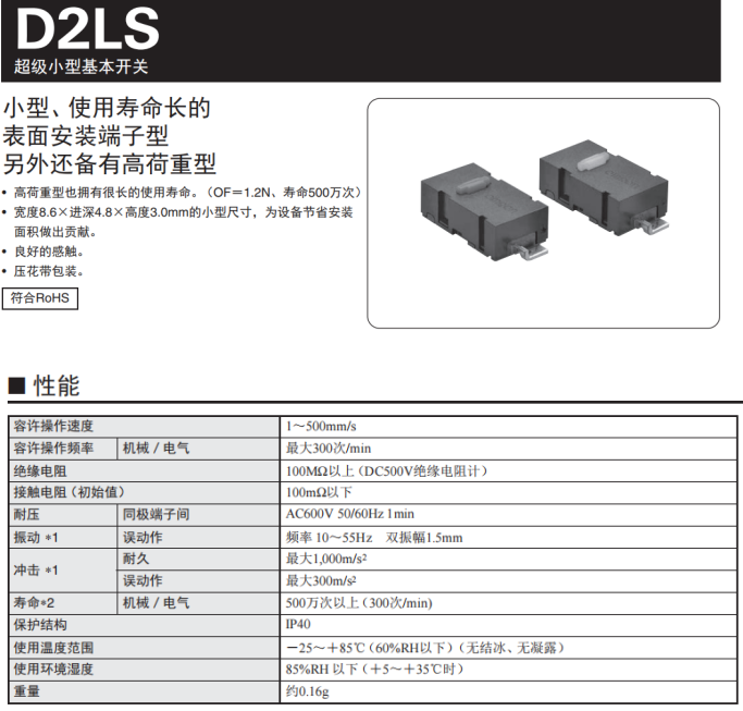 歐姆龍D2LS系列開(kāi)關(guān),高荷重型也擁有達(dá)到500萬(wàn)次的電氣壽命,超級(jí)小型身材,寬度8.6*進(jìn)深4.8*3.0mm尺寸,為設(shè)備節(jié)省安裝面積,觸感良好,容許操作速度1~500mm/s,操作頻率最大300次/min,重量?jī)H有0.16g。