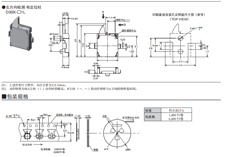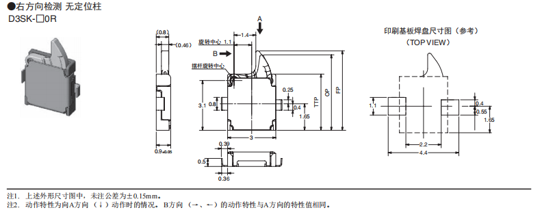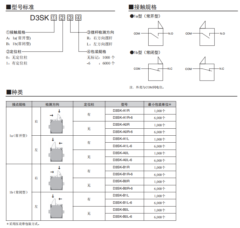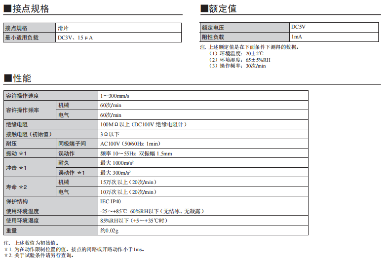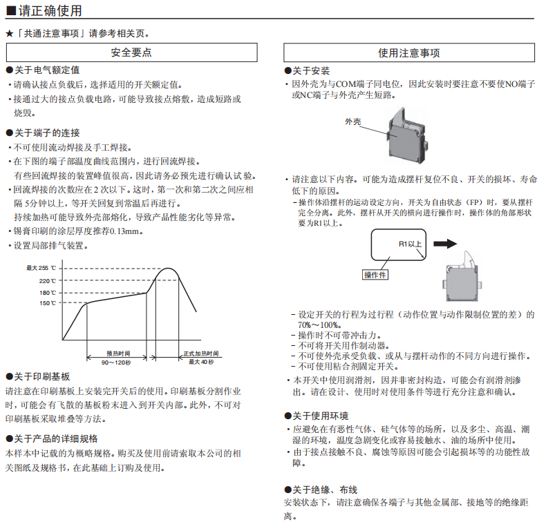 「社內較小級」可實現高精度動作的檢測開關 (寬3.0mm×長3.5mm×厚0.9mm) 小型及薄型,為機器的小型化、薄型化作貢獻。 特定的接點機構,實現了高精度的動作位置及高可靠性的接觸。 長行程提高了使用的便捷性。 接觸規格(1a、1b)及多種擺桿,可適合范圍寬廣的各種用途。